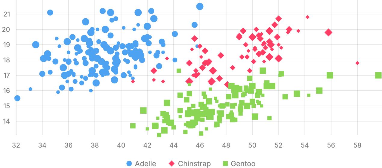 - Shape rendering. Each series type draws its own SVG elements: lines, rectangles, arcs, points. D3 provides shape generators, React manages the lifecycle of elements.